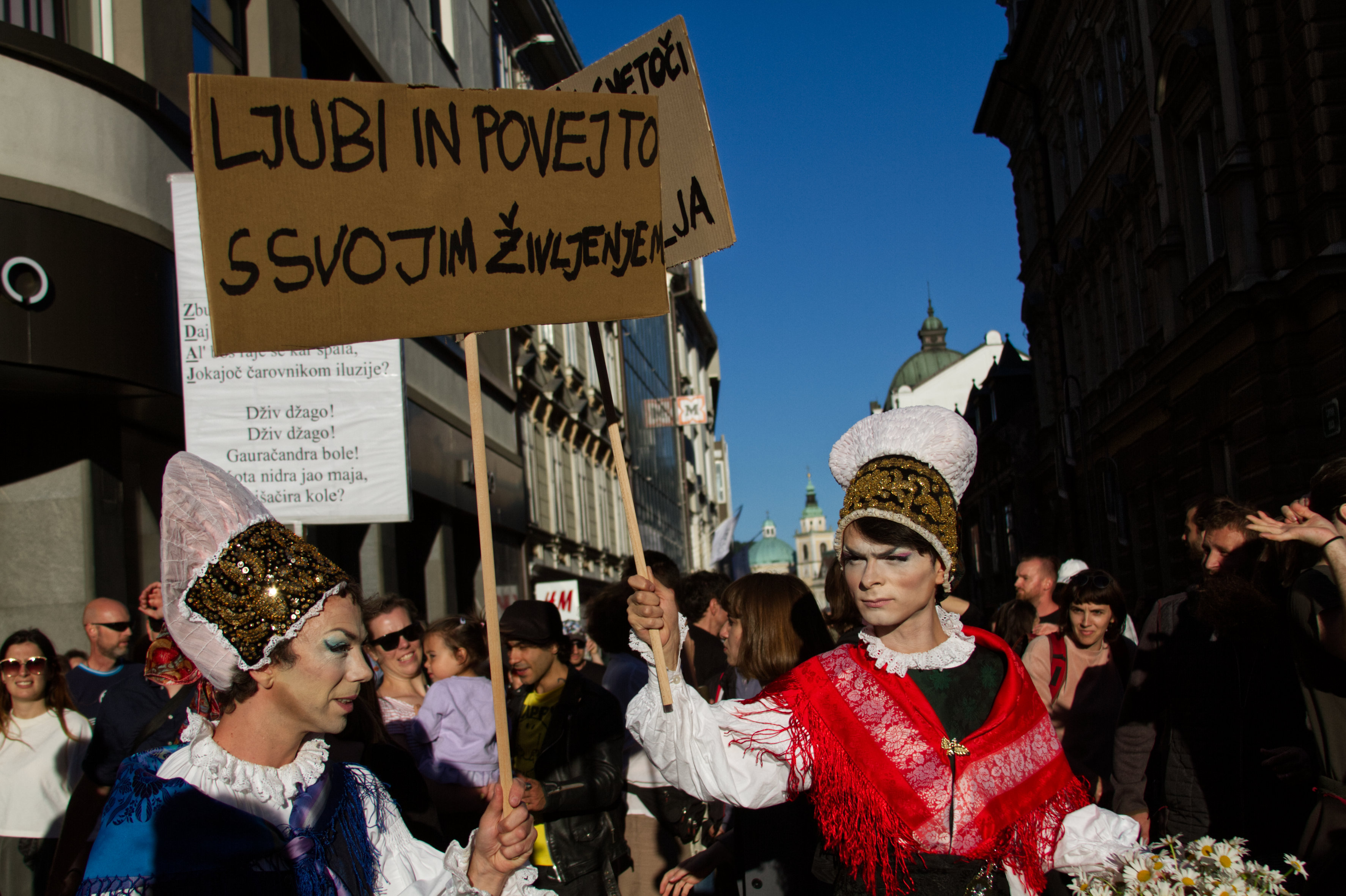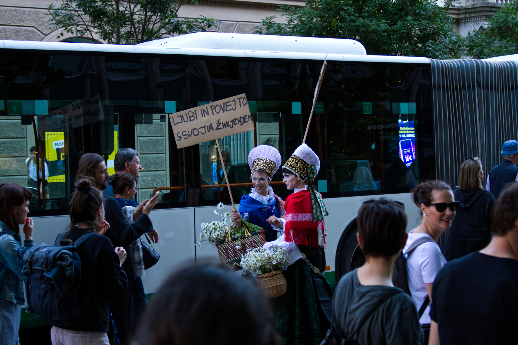 Državljanki Dragana in Dragica sta v letu 2020 potovali. Po kolesarskih protestih, po točkah vzpostavljanja nove državnosti, po ključnih simbolih slovenstva. Odeti v narodno nošo v prepevanju tistih starih, dobrih, domačih napevov. Kdor poje, slabo ne misli. Dlje kot sta hodili, bolj sta si želeli, da ne bi bile toliko državljanki, ampak raje prebivalki. Zdaj sta prispeli v gledališče. Napočil je čas za Jubilej.